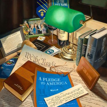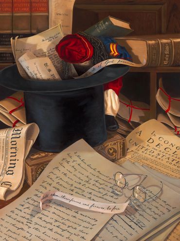Here, you can discover the stories or the person told through different documents and objects gathered in a classically rendered still life and slowly discover a link to the items. Some may be obvious, others not so clearly seen or easily distinguished. Who or what is the painting about?